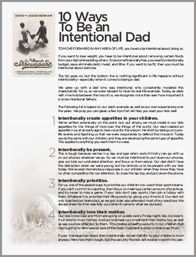 We grew up with a dad who was intentional, who consistently modeled this characteristic for us, so we were blessed to have his real-life example. Today, as dads with nine kids between the two of us, we recognize more than ever how important it is to be intentional fathers. The following list is based on our dad’s example as well as our own experiences: