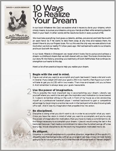 The Fair Grounds Field in Shreveport, Louisiana could be summed up in two words for the Benham Brothers – joy and a dream. That dream brought them to the pinnacle of success and the lessons of failure, both in professional baseball and in a multi-million dollar business. But it was a certain childhood dream and an eventual experience in a beat-up stadium in Shreveport, LA that could only be described as a miracle. Though many years have passed, the testimony of this miracle has given the brothers strength to continue living boldly for their faith.